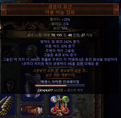 이 녀석도 직작을 해보려고 엘더 베이스 투구에 장착된 젬 스킬의 원소 피해 30% 증폭 옵이 붙는 경악의 에센스를 몇 번 던져봤다. 경악의 에센스 옵 + 화상 피해 보조 / 효과 집중 보조 + 알맞은 나머지 옵을 만들기가 어렵겠다 싶어서 그냥 보조 옵이 2개 달린걸 구매했다. 살때는 약 2엑 정도에 샀던것 같다.
