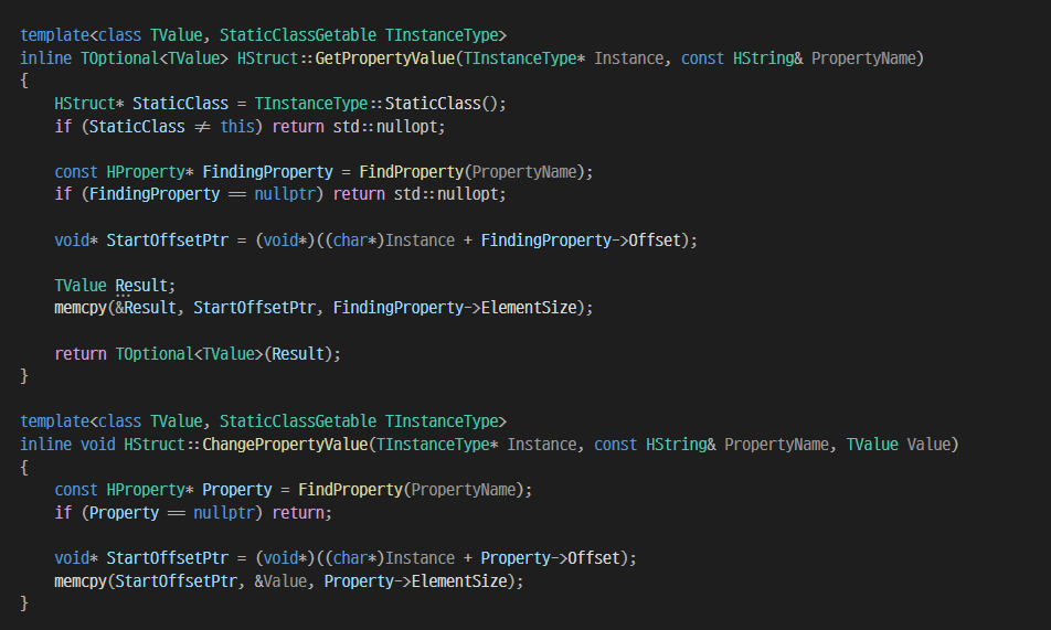 각각의 메서드들은 함수 인자로 들어온 프로퍼티의 이름을 통해 Property 정보를 찾아온다. Property 객체는 해당 프로퍼티가 클래스 메모리 레이아웃의 얼마만큼의 Offset으로부터 얼마만큼의 Size로 위치해있는지를 기록해 놓은 것이기 때문에, 결국 Instance의 포인터를 이용하면 해당 프로퍼티의 메모리에 접근할 수 있겠다는 생각이었다.